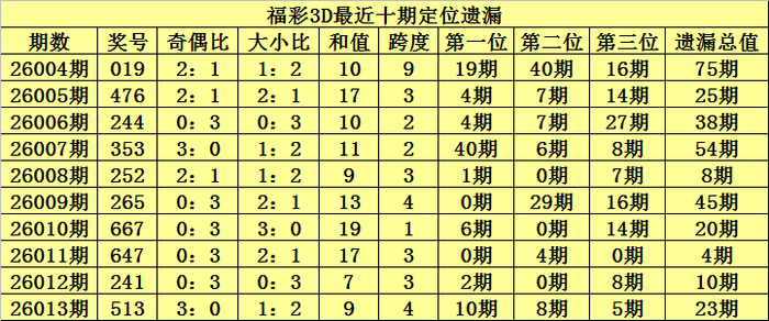 开奖回顾:福彩3D第2026013期奖号:513,百位号码遗漏10期、十位号码遗漏8期、个位号码遗漏5期,遗漏总值为23期。
